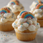 Whimsical and colorful cupcakes that resemble fluffy clouds, perfect for parties, celebrations, or adding a bit of magic to your dessert table.